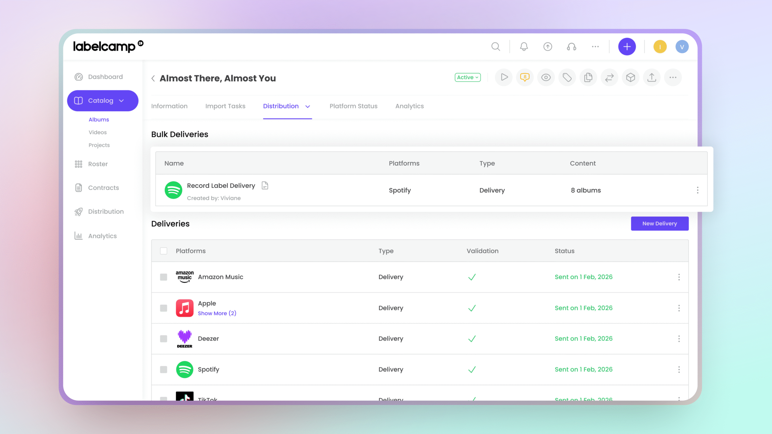 We’ve improved visibility for product deliveries made as part of bulk sendings in Labelcamp. From now on, when a product is included in a bulk delivery, that delivery will automatically appear in the related product’s deliveries page.